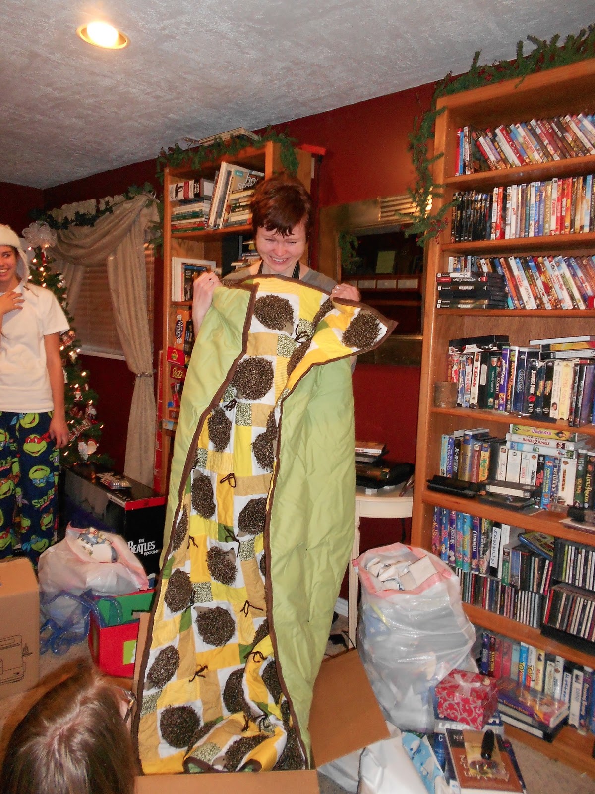 Our family has a tradition where we draw a family name and have to hand make a gift for them that year. Every year the opening of the homemade gifts is my favorite part. I just love to see what everyone is able to come up with, and there is just so much meaning behind everything that gets made. Sorry, got a little sidetracked, anyway, this year my sister Kalena drew my name and she made me these amazing almost footie pajamas with out feet! LOVED them! My mom drew Paul and she made him a ladder ball game (so stinking cool). I got Yulia this year so I made her a pretty sweet quilt with lots of little hedgehogs (she loves hedgehogs). The look on her face was priceless when she opened it up and saw what it was.